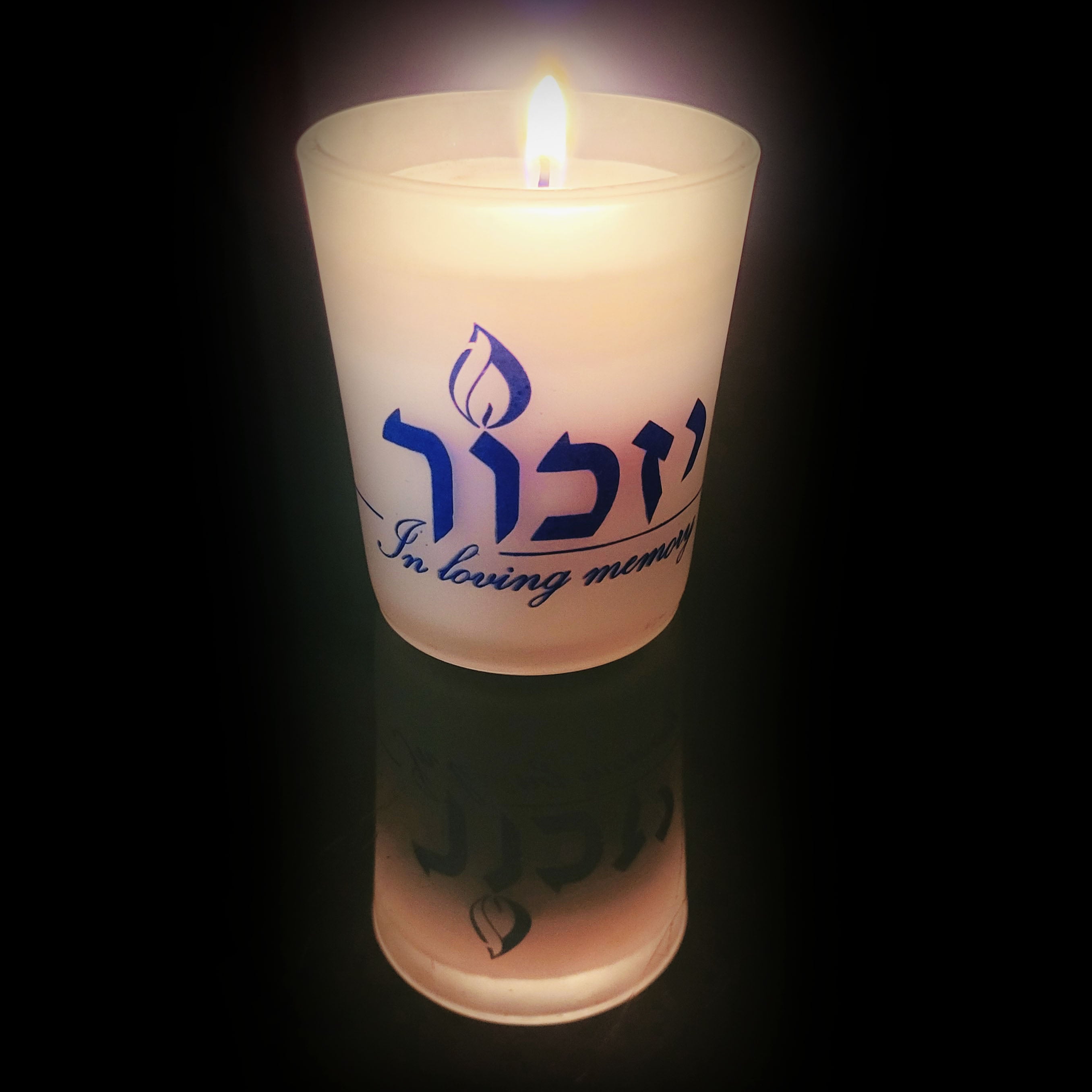 Remember the passing of your loved ones with this unique elegant Yizkor candle. This candle is presented in an elegant frosted glass cup with the world "Yizkor" written in navy in Hebrew