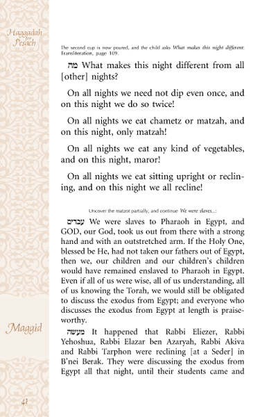 Each part of the Seder is illuminated with clear, step-by-step instructions, which guide the participant through the often-times complicated order of the Seder night.