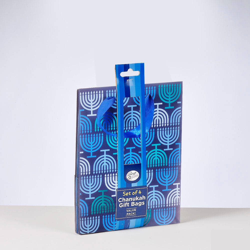 Gift Chanukah in lux style with these artistic and attractive gift bags! Featuring foil accents and hot stamping, this set of 4 gift bags sport the finishing touch of elegant ribbon handles that present your gift with an elevated presentation of Chanukah style!