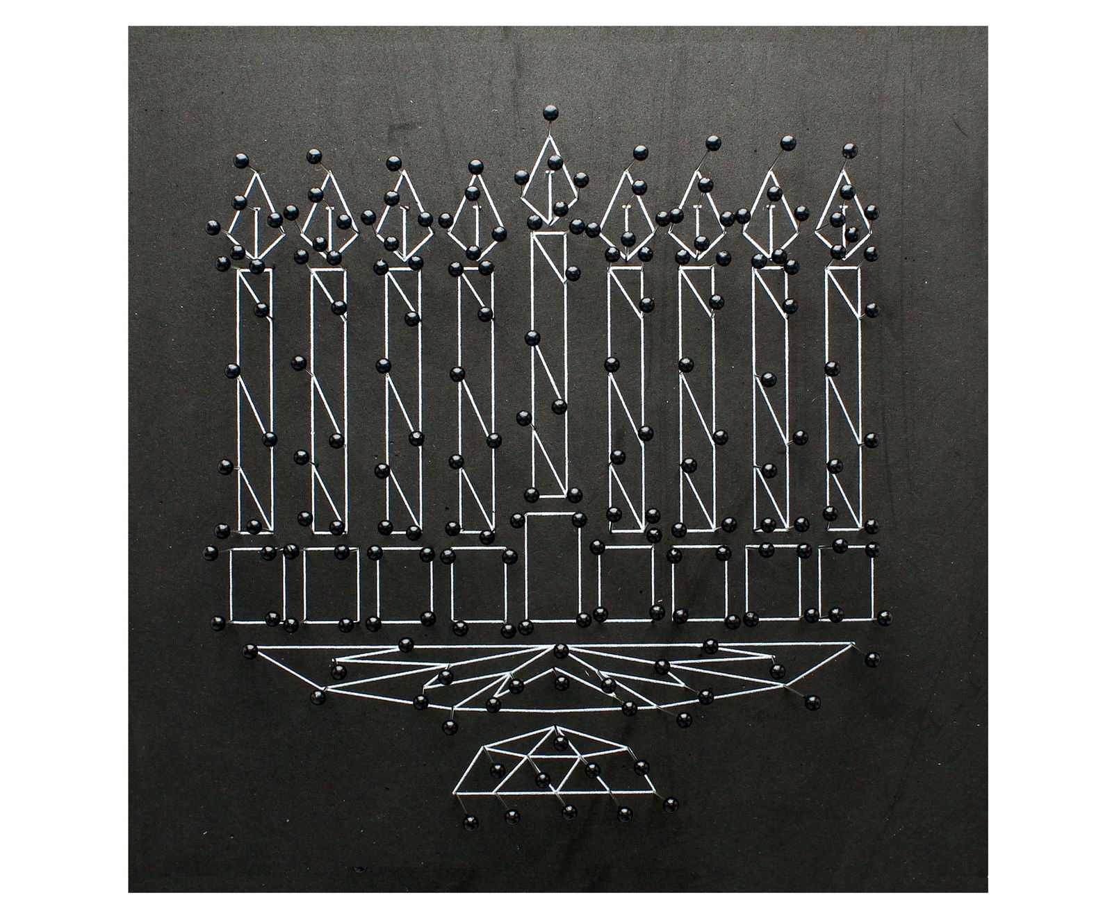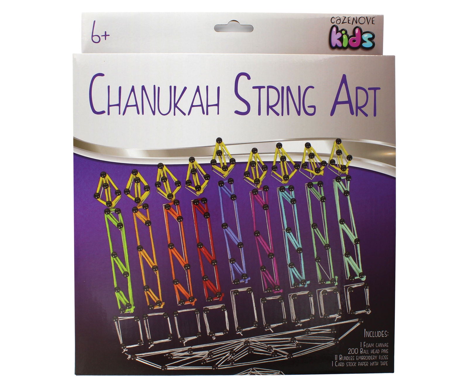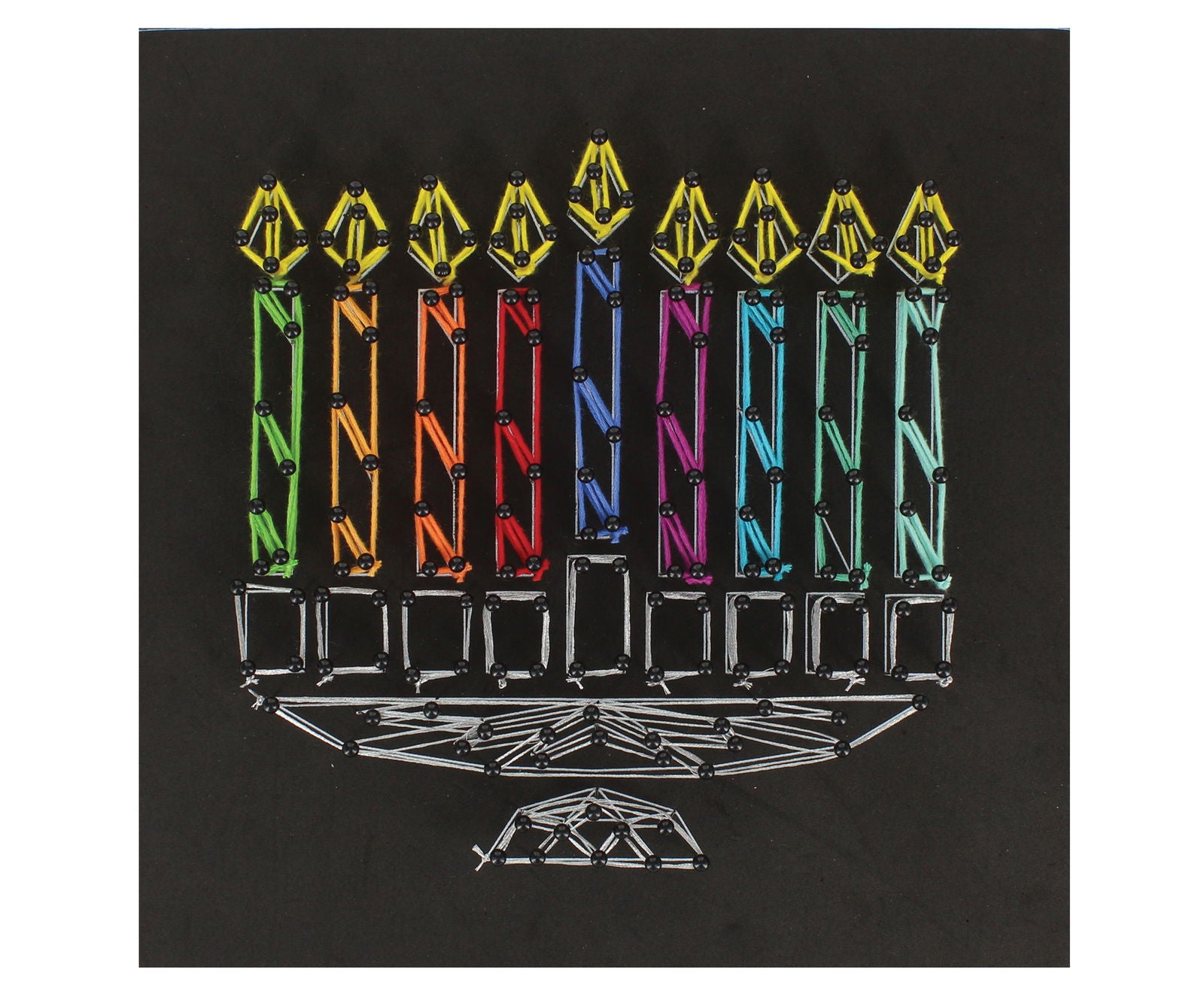 This beautiful hand crafted Menorah is the perfect Chanukah gift for kids giving hours of fun and creativity for their mind. This Chanukah string art comes with everything you need to create this beautiful design, one foam canvas, two hundred ball headed pins, eleven coloured bundles of wool and one card stock paper with tape. Suitable for children of 6+ years of age.