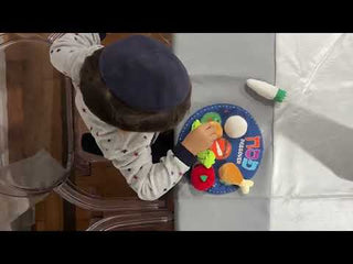 Young children will love to create their own mock Seder with this Soft Seder Kit! The primary components of the Seder plate are recreated in soft plush for safe and endless fun and play! The K'arah (Seder Plate), the focal point of the Seder, contains 6 symbols: 1. Z'roah (shank bone): represents the Paschal lamb eaten on Passover during the era of the Great Temple. 2. Beitzah (egg): symbolizes the cycle of life. 3. Charoset (a mixture of crushed fruit, nuts and wine): reminder of the mortar used in the building of the Pyramids. 4. Karpas (vegetable), such as parsley or potato is dipped in salt water: The salt water reminds us of the tears of the enslaved Jews. 5. Maror (bitter herb): symbolic of the bitterness of slavery in Egypt. 6. Chazeret (lettuce): an additional bitter herb.