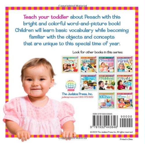 Teach your toddler about Pesach with this bright and colorful word-and-picture book! Children will learn basic vocabulary while becoming familiar with the objects and concepts that are unique to this special time of year.