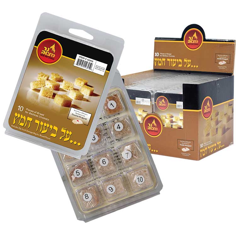 10 pieces of bread for bedikas chometz. Each piece is tightly sealed in a poly bag